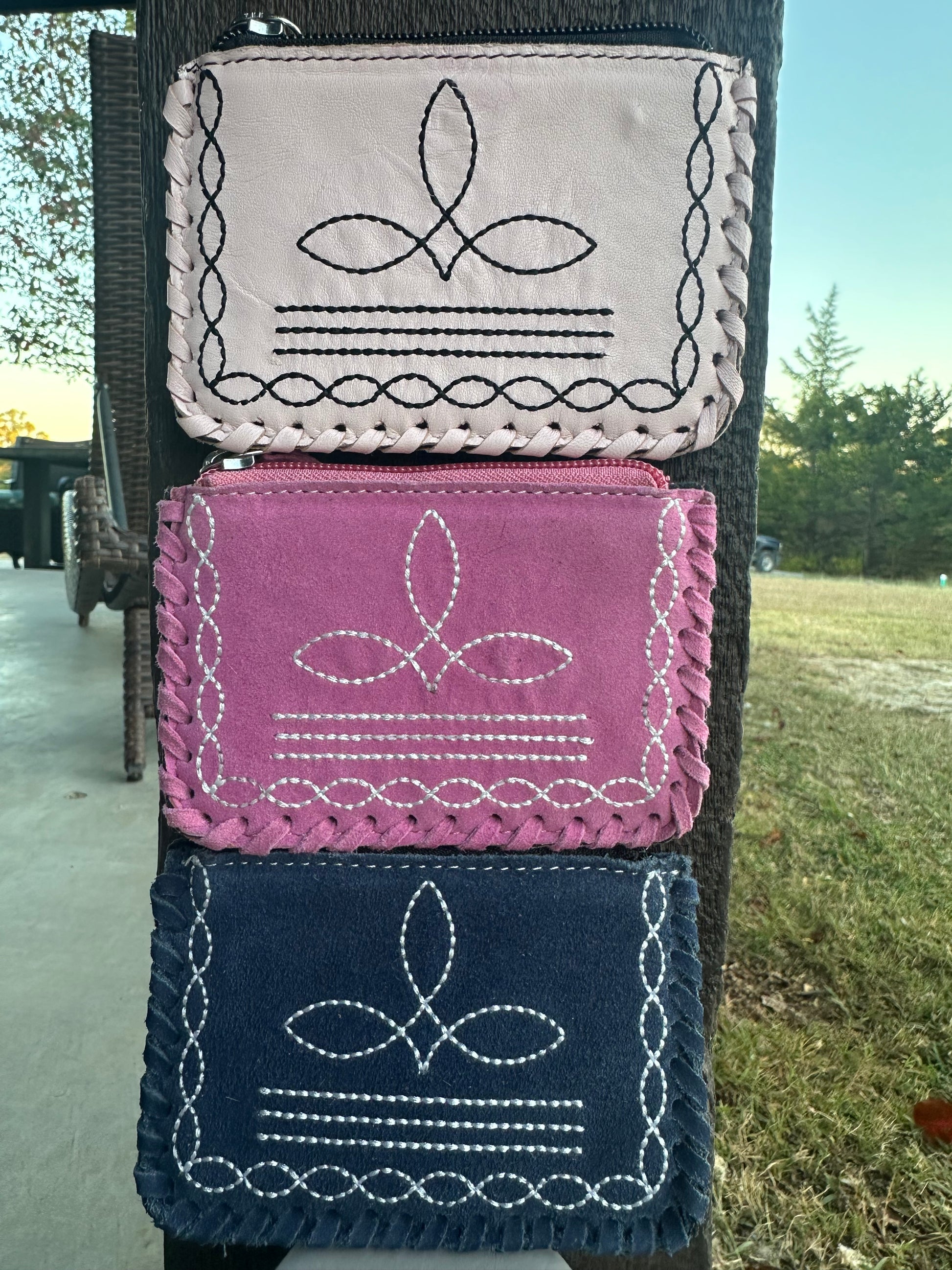 5“ x 3 1/2“ the navy blue and hot pink are suede. The pink is leather boot stitch coin purse