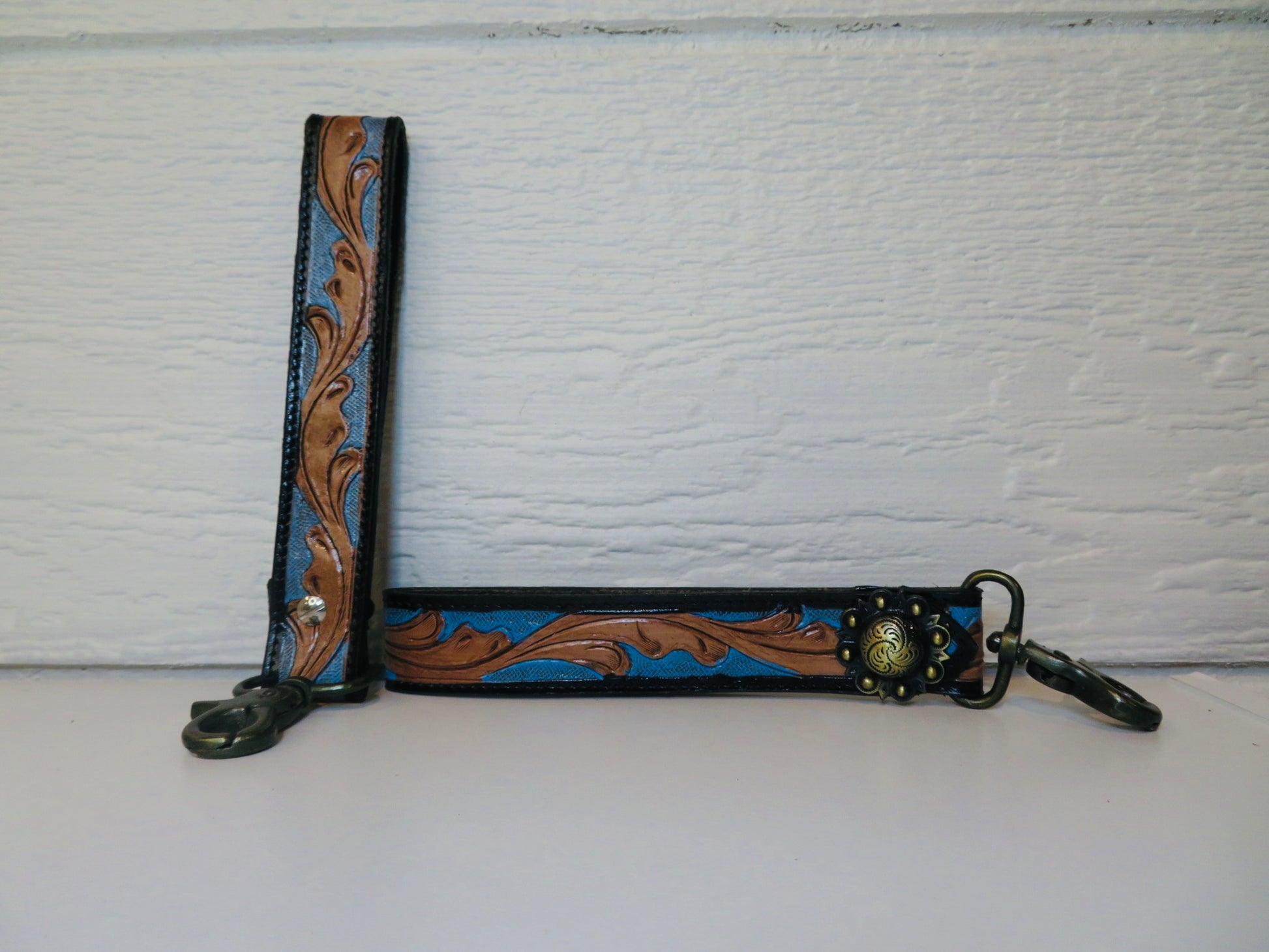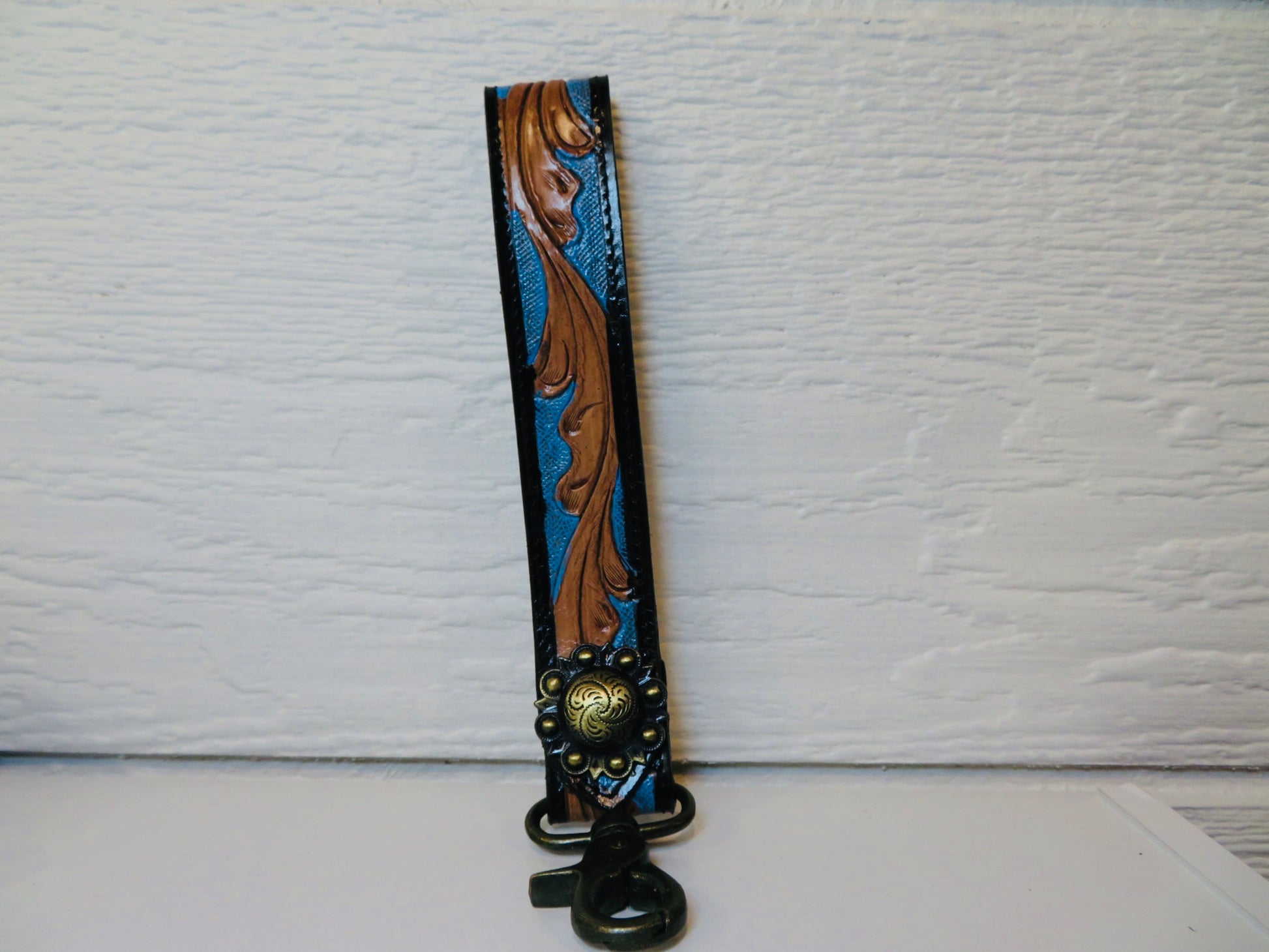 1/7 inch tooled leather keychain black with tan and blue with concho.. sold as singles