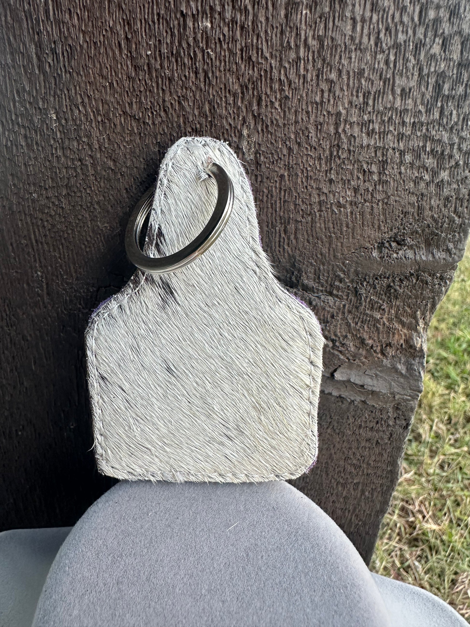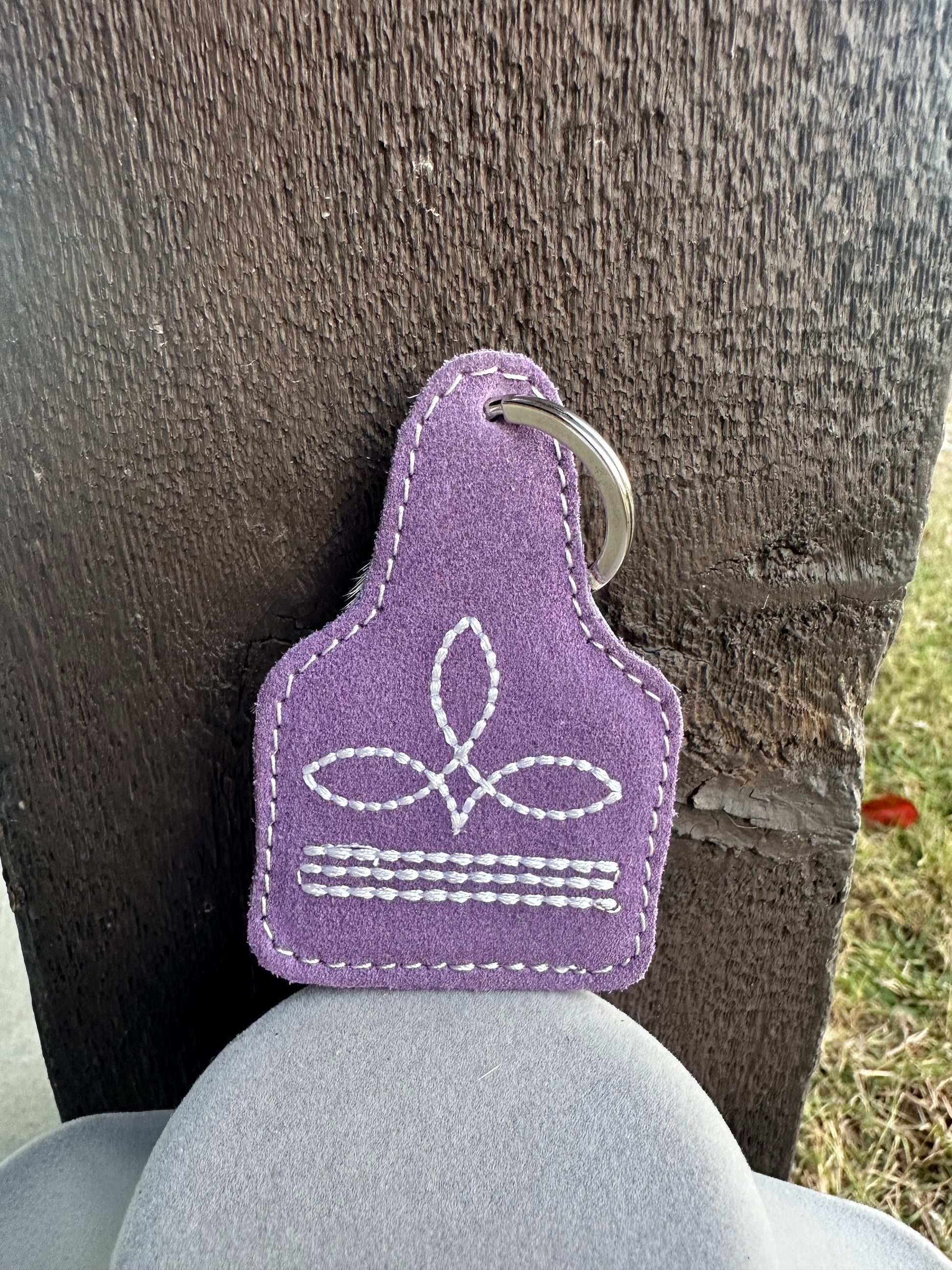 A little under 3 1/2 inch by a little under 2 1/2 inch purple suede boot stitch, cow ear tag with cowhide