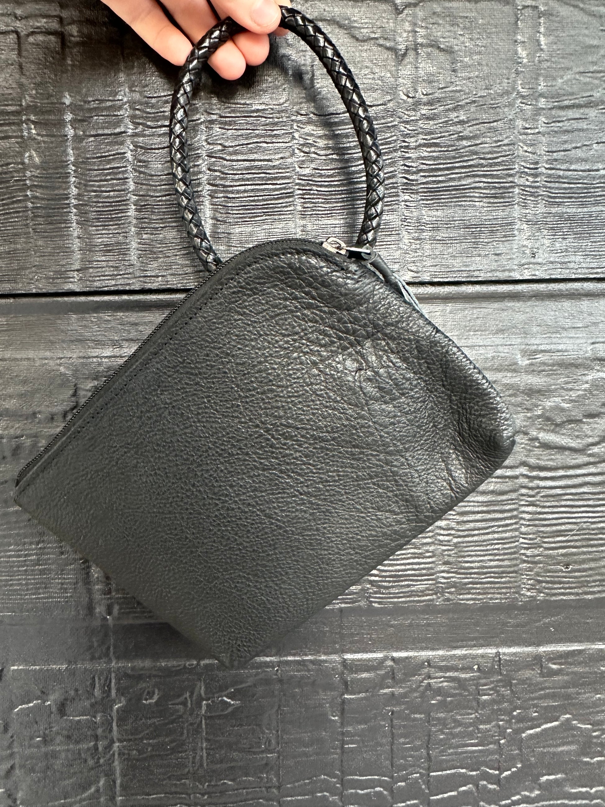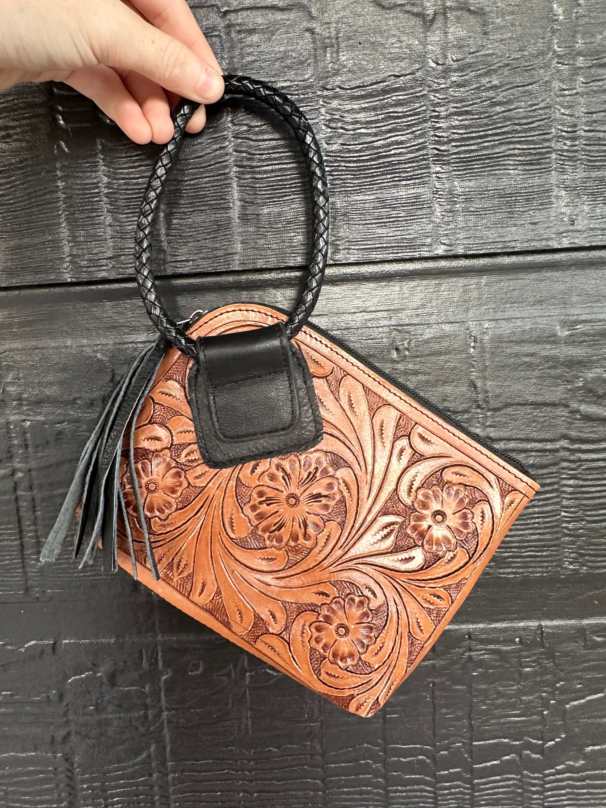 7 1/2“ x 6“ tooled leather clutch red velvet inside with card slots