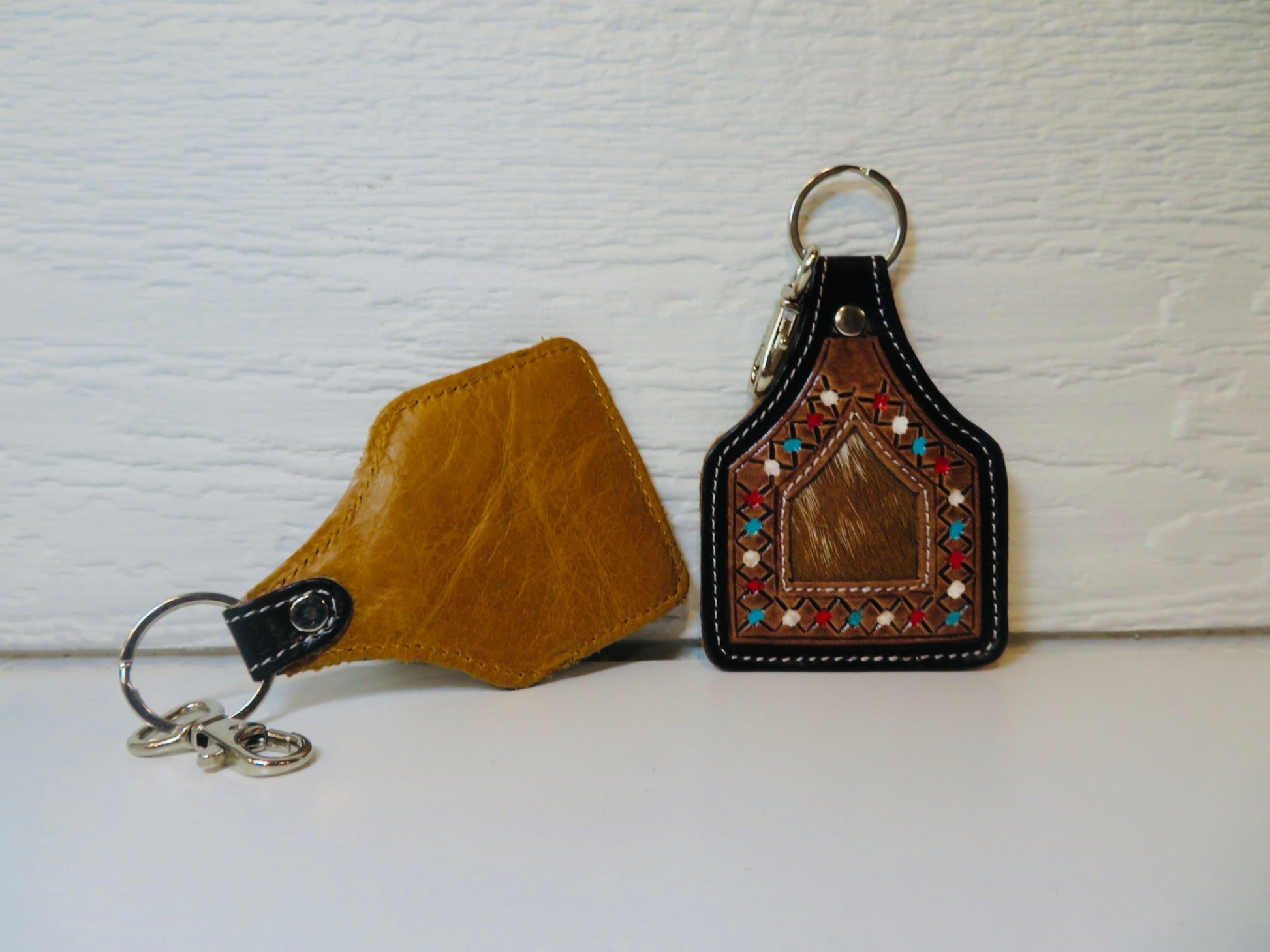 Tooled leather ear tag with cowhide